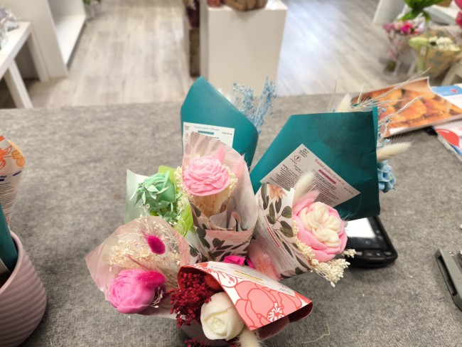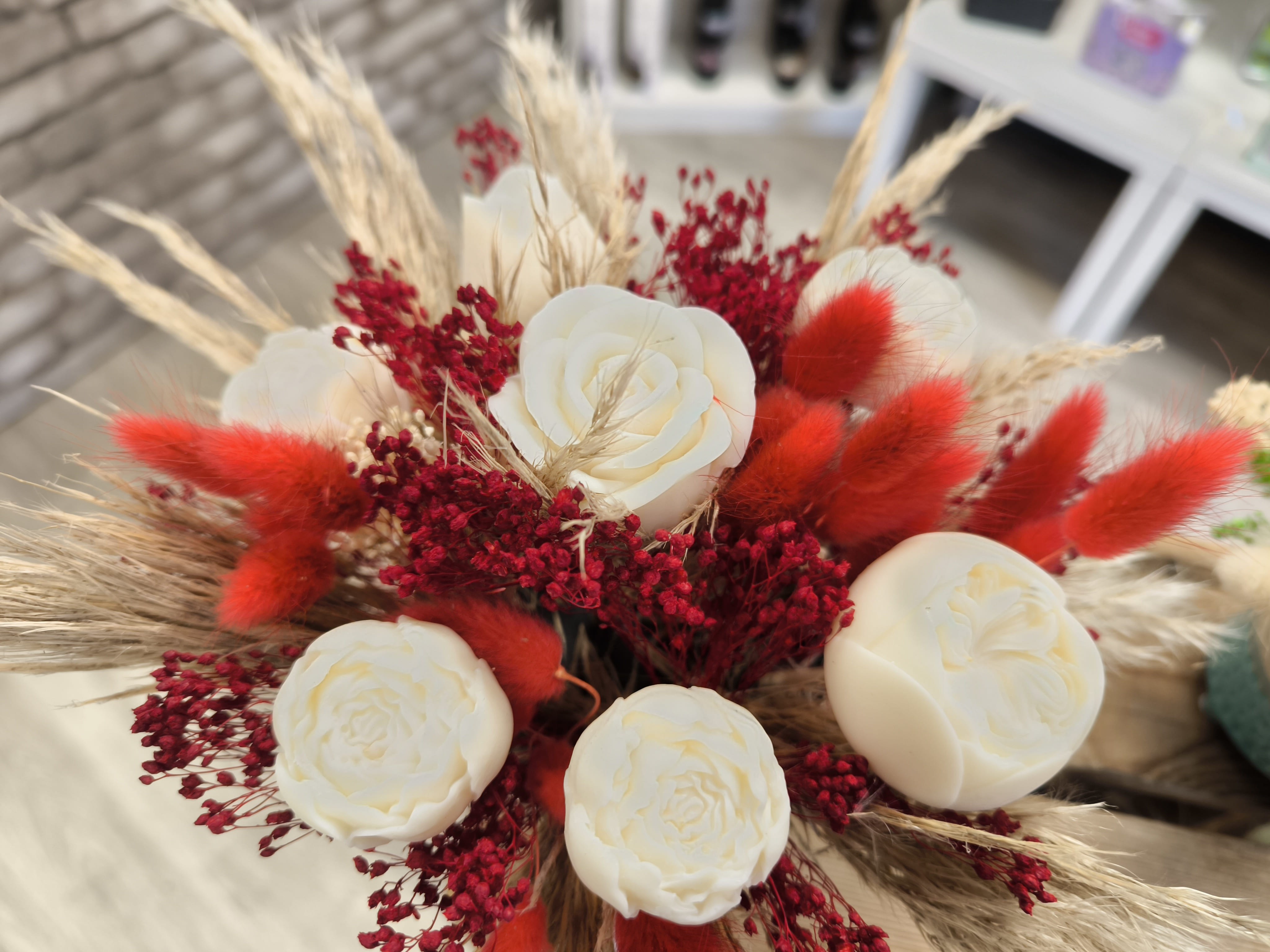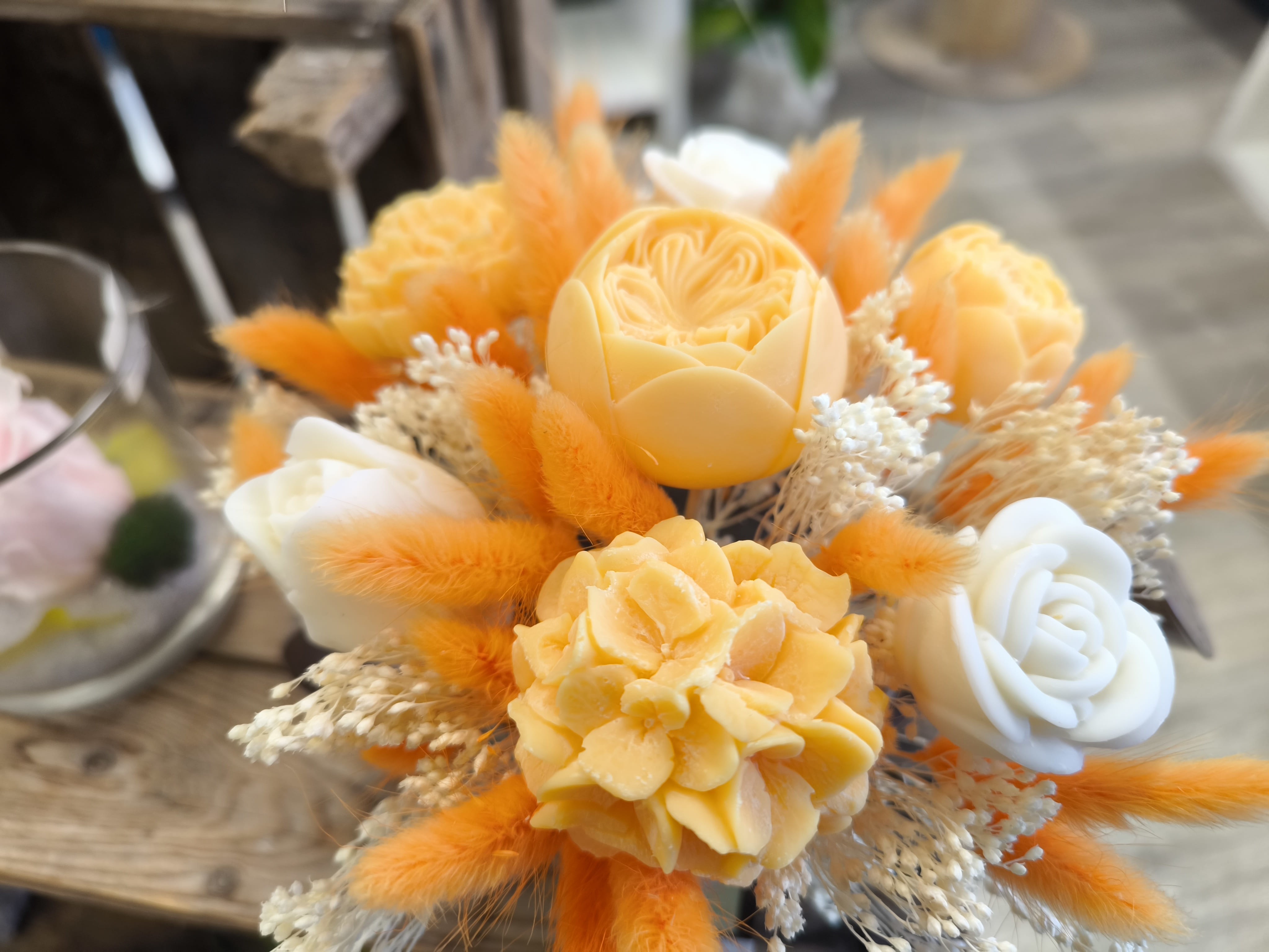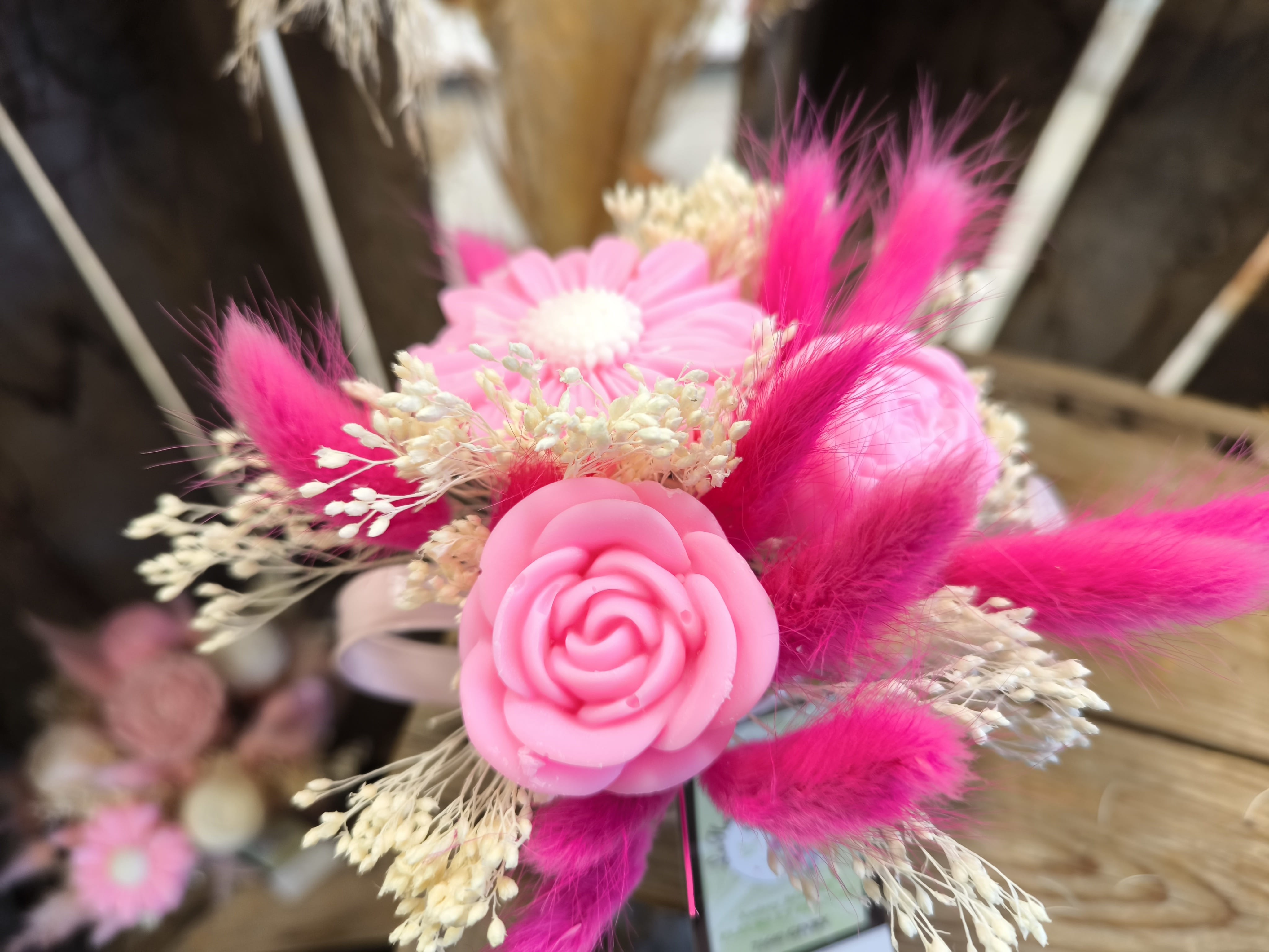 Chacune de ces compositions sont faites faites mains. Elles sont agrémenté de fleurs séchées.